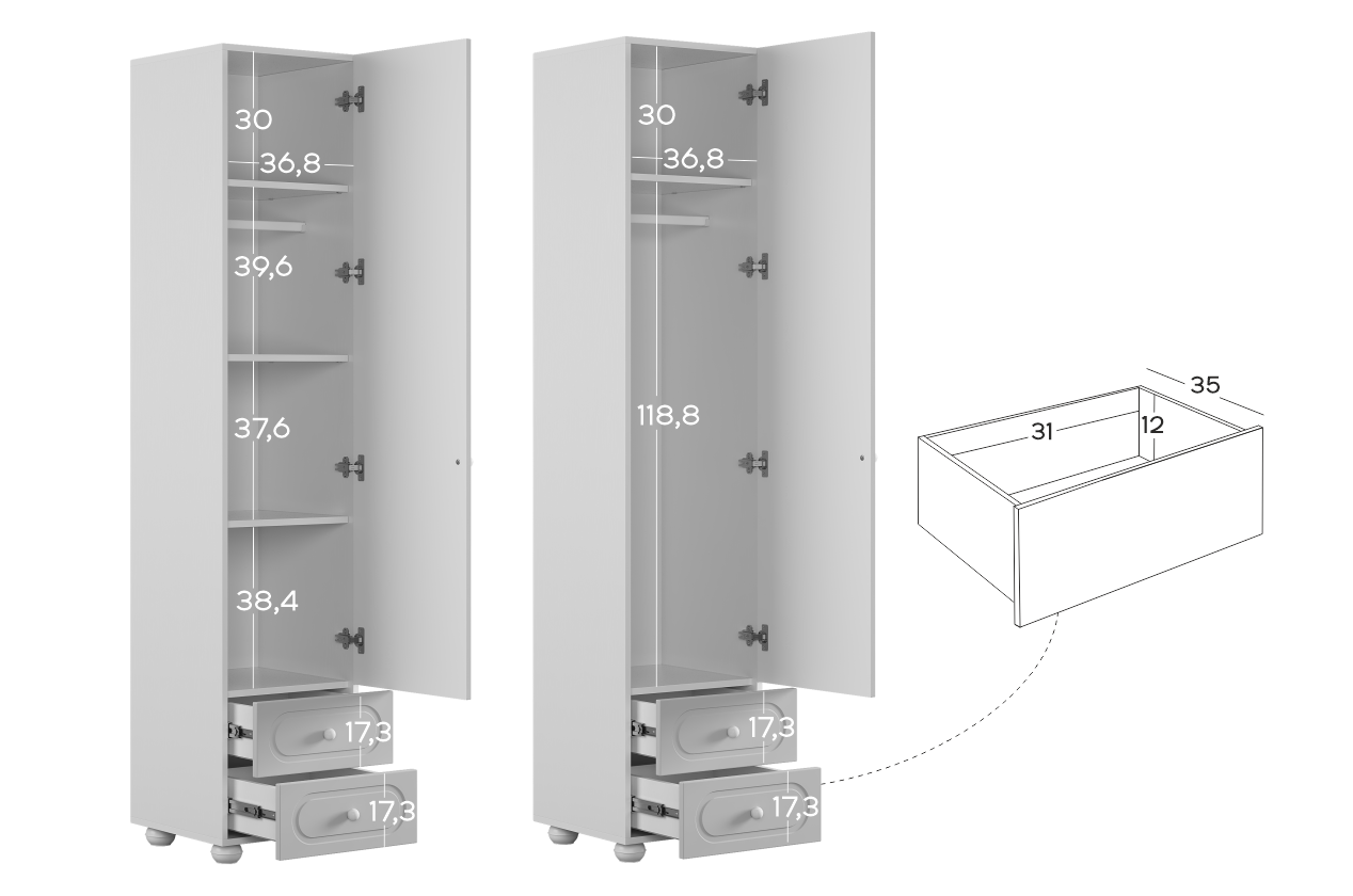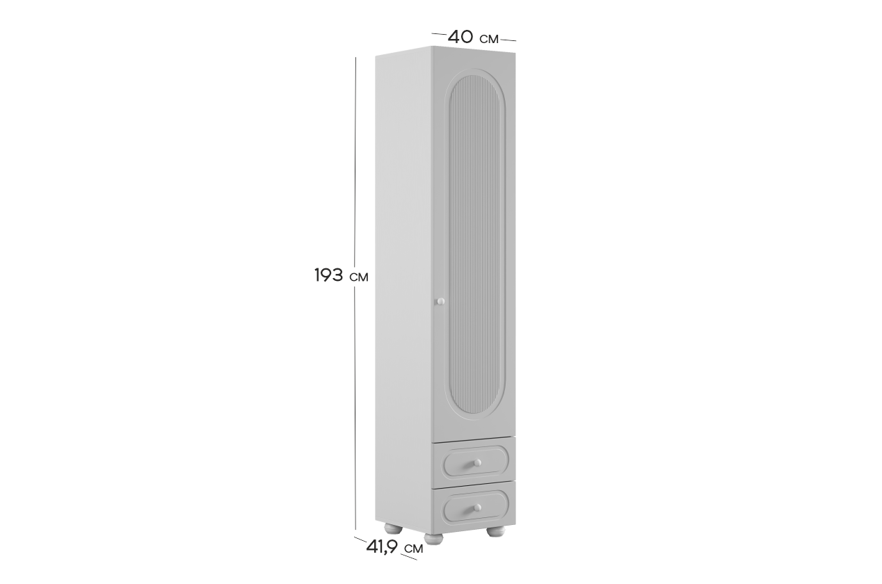 Модуль оснащён одной распашной дверцей и двумя вместительными выкатными ящиками в нижней части, предназначенными для хранения одежды, текстиля или аксессуаров. Внутреннее наполнение можно выбрать в зависимости от потребностей: шкаф может быть укомплектован полками или штангой для плечиков, что делает его удобным для хранения как сложенных вещей, так и одежды на вешалках.