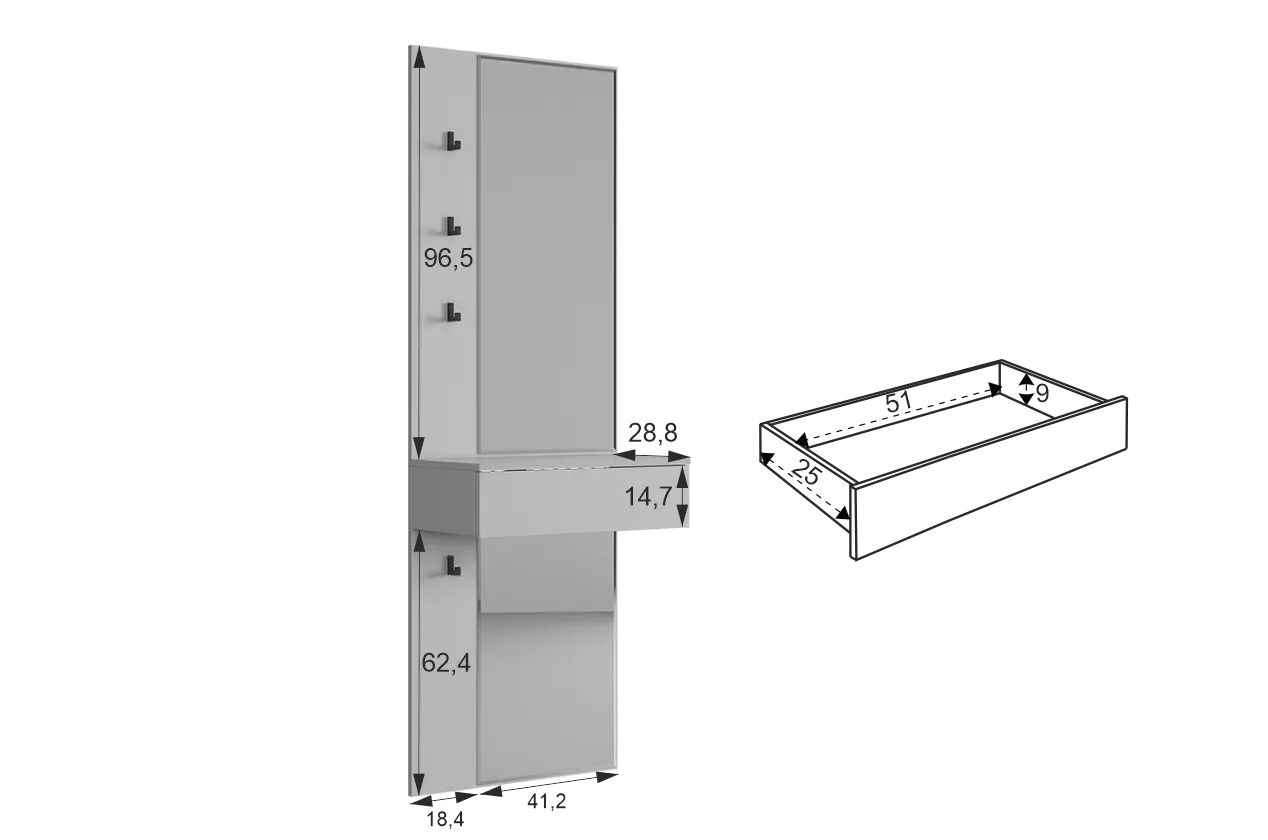 Крючки предоставляют удобное место для хранения сумок или аксессуаров. Выкатной ящик служит дополнительным пространством для хранения мелочей, таких как ключи, кошелек, косметика или другие небольшие предметы.