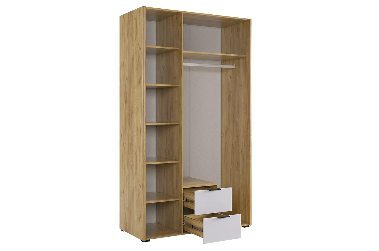 Вместительный шкаф имеет полки, ящики выдвижные и штангу для одежды, а полукруглые, обтекаемые углы обеспечат безопасность и комфорт.
