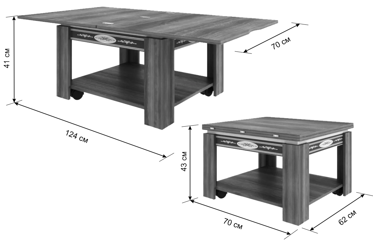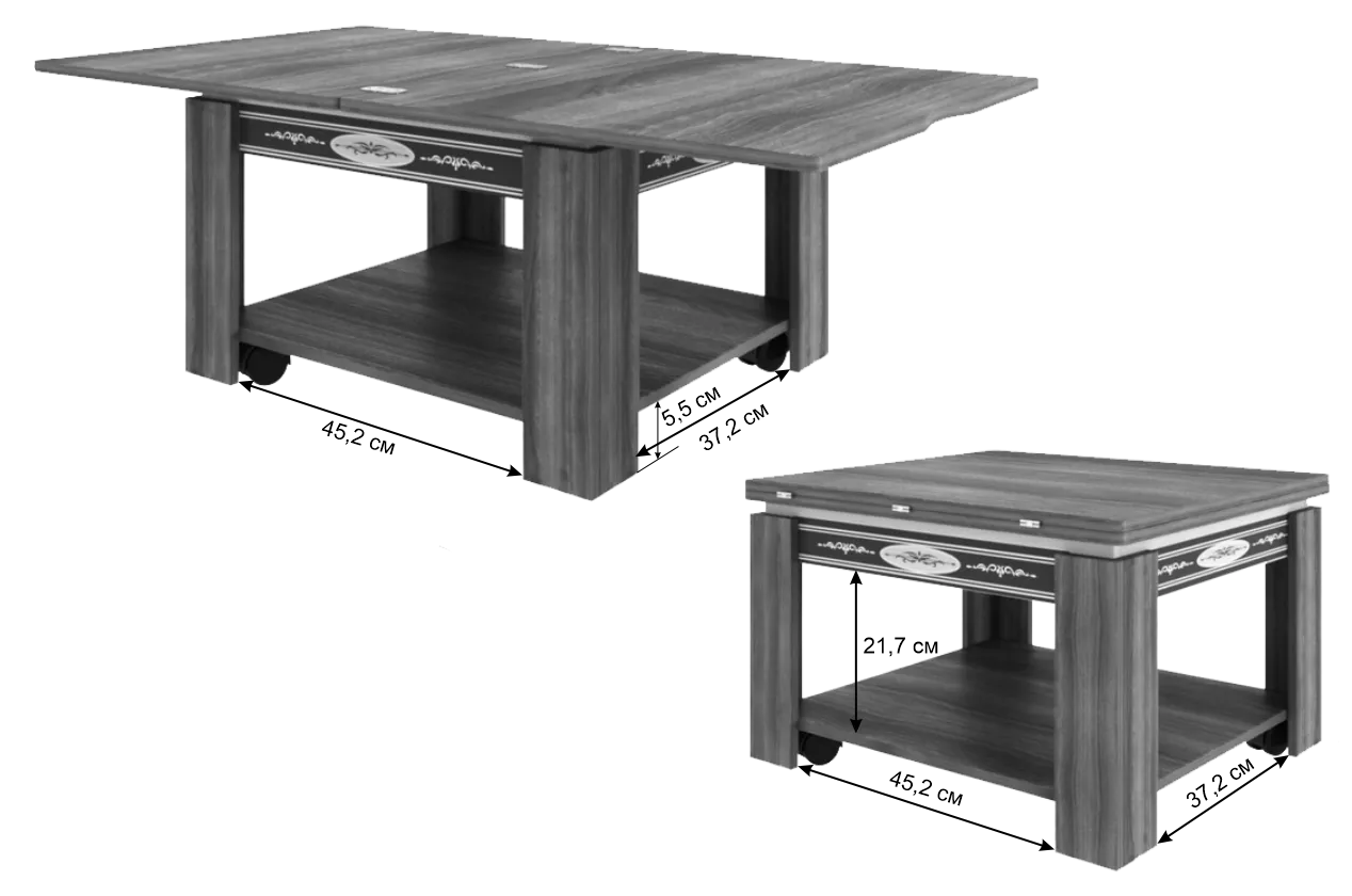 Журнальный столик Адам: Элегантный столик, который идеально подойдет для дополнения как классического, так и современного интерьера вашей гостиной или спальни. Изящный рисунок на царге делает его уникальным и выделяющимся. Особенность этой модели - поворотно-раскладной механизм, благодаря которому вы быстро и легко сервируете стол для гостей. Дополнительная полка внизу предназначена для различных мелочей, а удобные колесики позволяют легко перемещать стол по комнате. Принтерная печать использовалась для нанесения рисунка на поверхность стола.