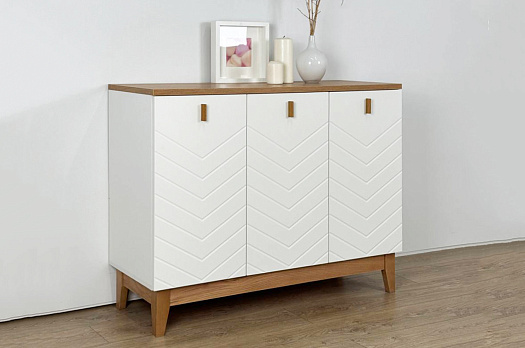 Корпус комода выполнен из ЛДСП в цвете белое дерево, что придаёт ему светлый и уютный вид, характерный для скандинавского дизайна. Фасады – из МДФ с фрезеровкой, покрытые матовой белой плёнкой, что подчёркивает натуральность текстуры и создаёт ощущение лаконичности.