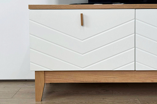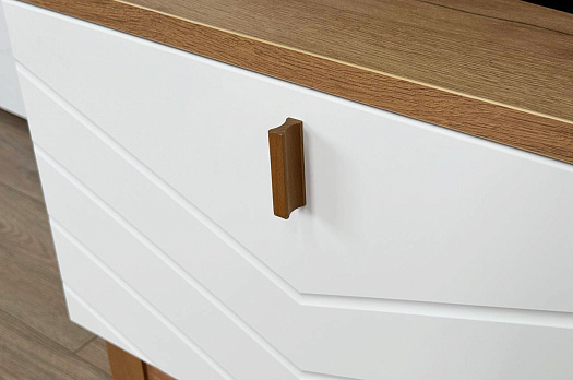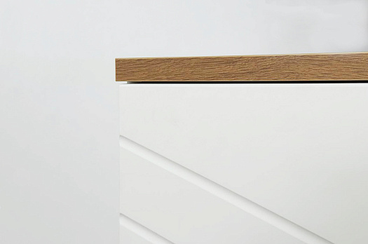 Корпус тумбы выполнен из ЛДСП в цвете белое дерево, что придаёт ей светлый и уютный вид. Фасады – из МДФ с фрезеровкой, покрытые матовой белой плёнкой ПВХ, что подчёркивает натуральность текстуры и создаёт ощущение лаконичности.