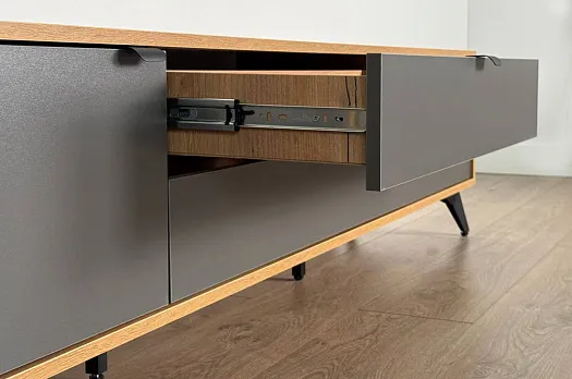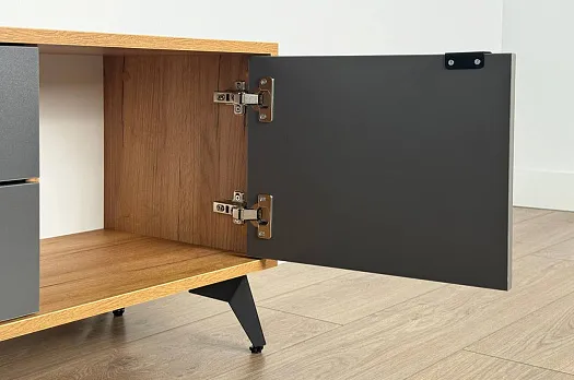 Модель выполнена из ЛДСП толщиной 16 мм, оснащена двумя выдвижными ящиками на шариковых направляющих и двумя закрытыми секциями.