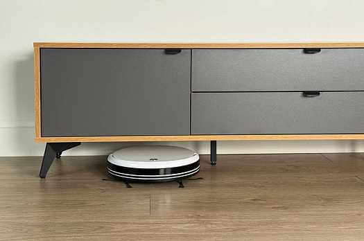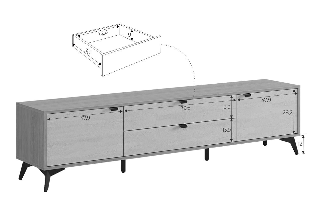 Модель выполнена из ЛДСП толщиной 16 мм, оснащена двумя выдвижными ящиками на шариковых направляющих и двумя закрытыми секциями.
