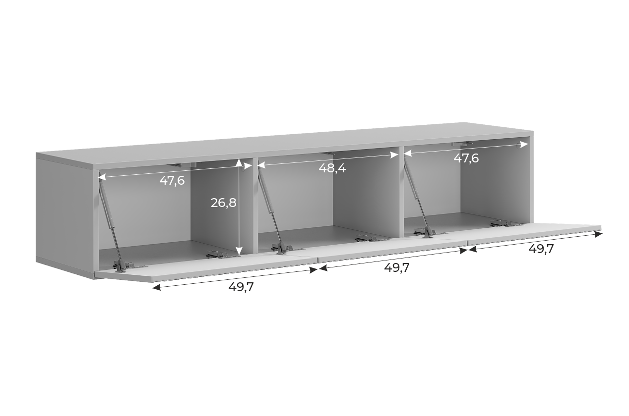 Модель выполнена из ЛДСП класса Е1, фасады изготовлены из МДФ с фрезеровкой и покрыты плёнкой ПВХ. Три дверцы оснащены газлифтами и системой толкателей PUSH, что обеспечивает удобство использования.