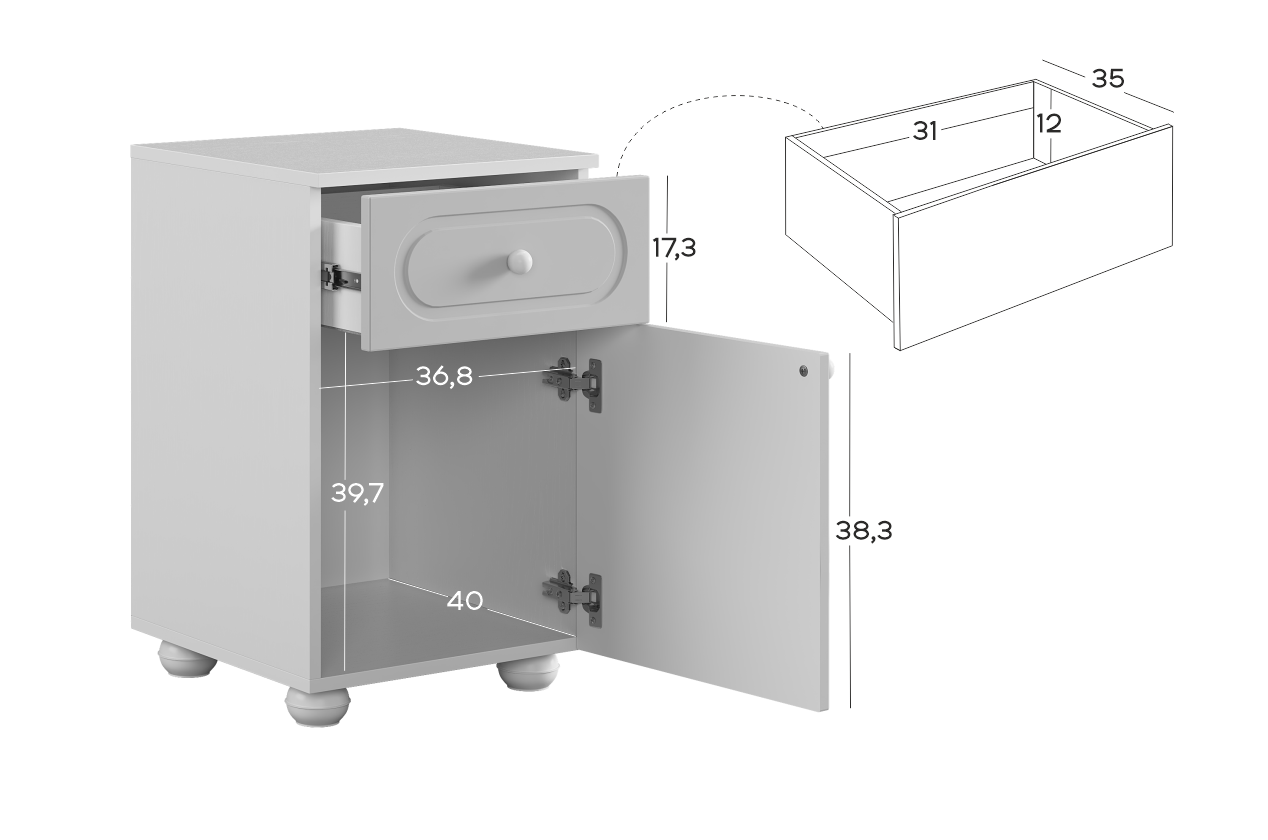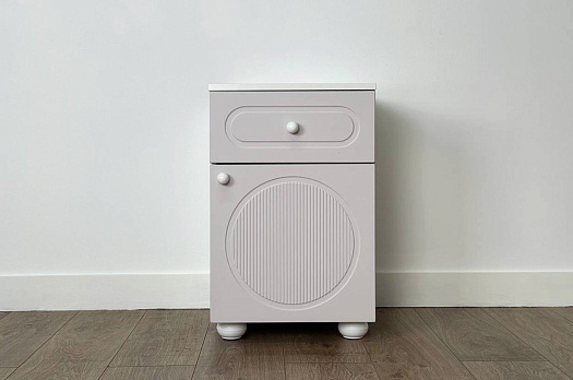 Милана Тумба (с ящиком) — универсальный модуль для детской комнаты, который может использоваться как прикроватная тумба или как компактный комод. Практичное сочетание ящика и закрытого отделения позволяет удобно хранить как мелкие, так и более объёмные вещи.