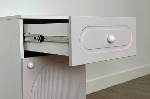Модель оснащена выкатным ящиком на шариковых направляющих, обеспечивающих плавный и надёжный ход. В нижней части расположено отделение с распашной дверцей, которое подойдёт для хранения книг, игрушек, аксессуаров или текстиля.