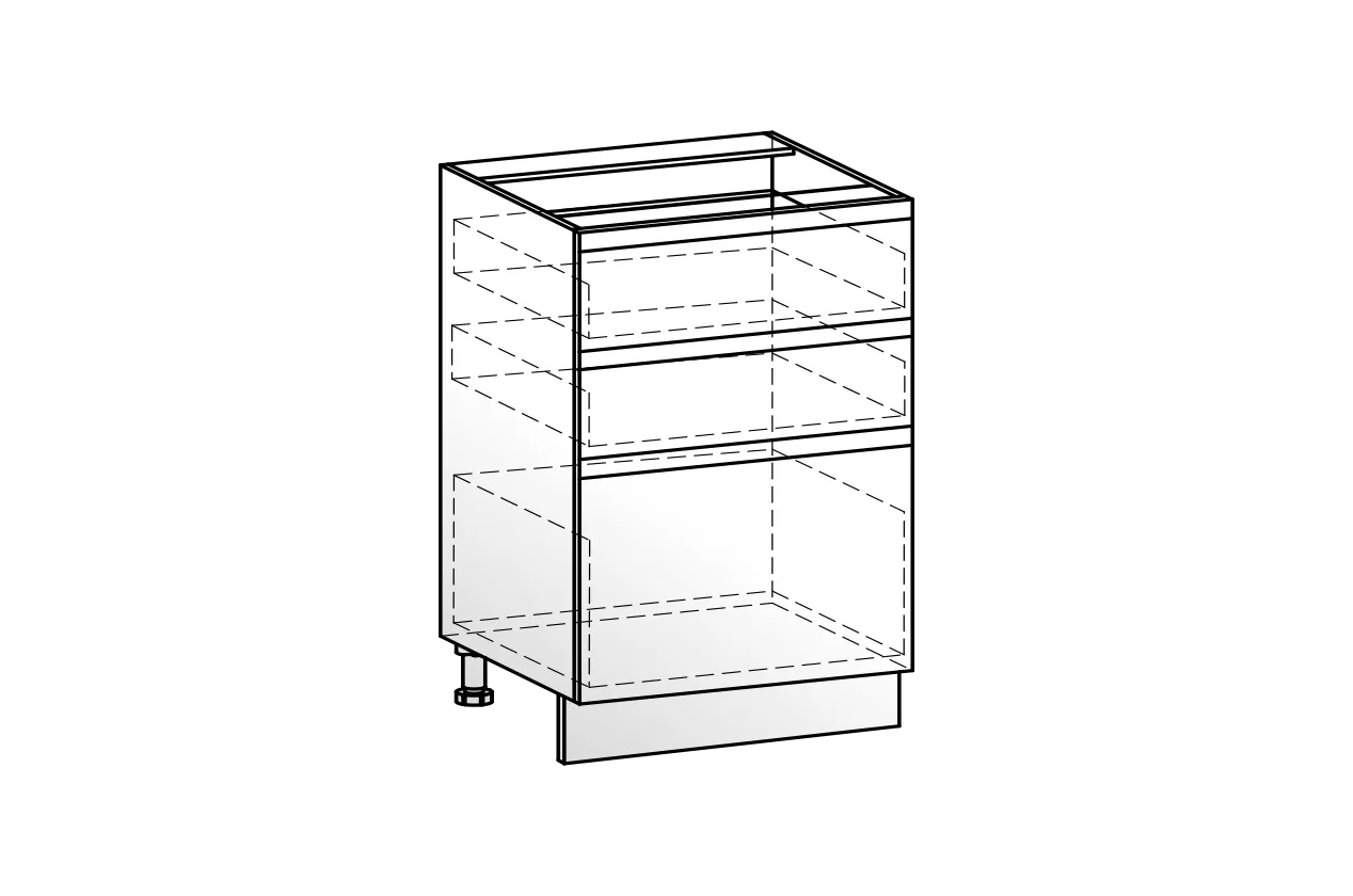 Рабочий шкаф с тремя вместительными выкатными ящиками — практичное решение для удобной организации хранения. Верхний ящик идеально подходит для размещения столовых приборов и мелких аксессуаров, средний и нижний — для кастрюль, сковород и другой кухонной утвари. Фасады выполнены из МДФ 19 мм, а система СТАРТ обеспечивает плавное, тихое и комфортное использование каждый день.
