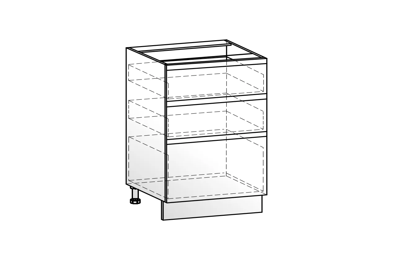Рабочий шкаф с тремя вместительными выкатными ящиками — практичное решение для удобной организации хранения. Верхний ящик идеально подходит для размещения столовых приборов и мелких аксессуаров, средний и нижний — для кастрюль, сковород и другой кухонной утвари. Фасады выполнены из МДФ 19 мм, а направляющие на ящиках Слим обеспечивают плавное, тихое и комфортное использование каждый день.