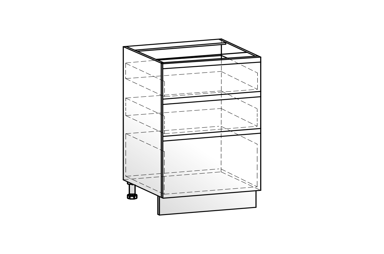 Рабочий шкаф с тремя вместительными выкатными ящиками — практичное решение для удобной организации хранения. Верхний ящик идеально подходит для размещения столовых приборов и мелких аксессуаров, средний и нижний — для кастрюль, сковород и другой кухонной утвари. Фасады выполнены из МДФ 19 мм, а система СТАРТ обеспечивает плавное, тихое и комфортное использование каждый день.