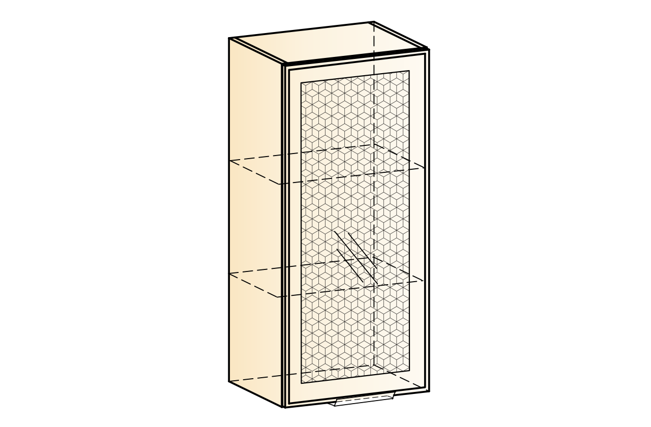 Навесной шкаф, с полками из серии «Стоун». Замечательно подойдет для хранения специй и круп, а так же посуды. Принтерный рисунок на стекле подчеркивает общий стиль кухни.