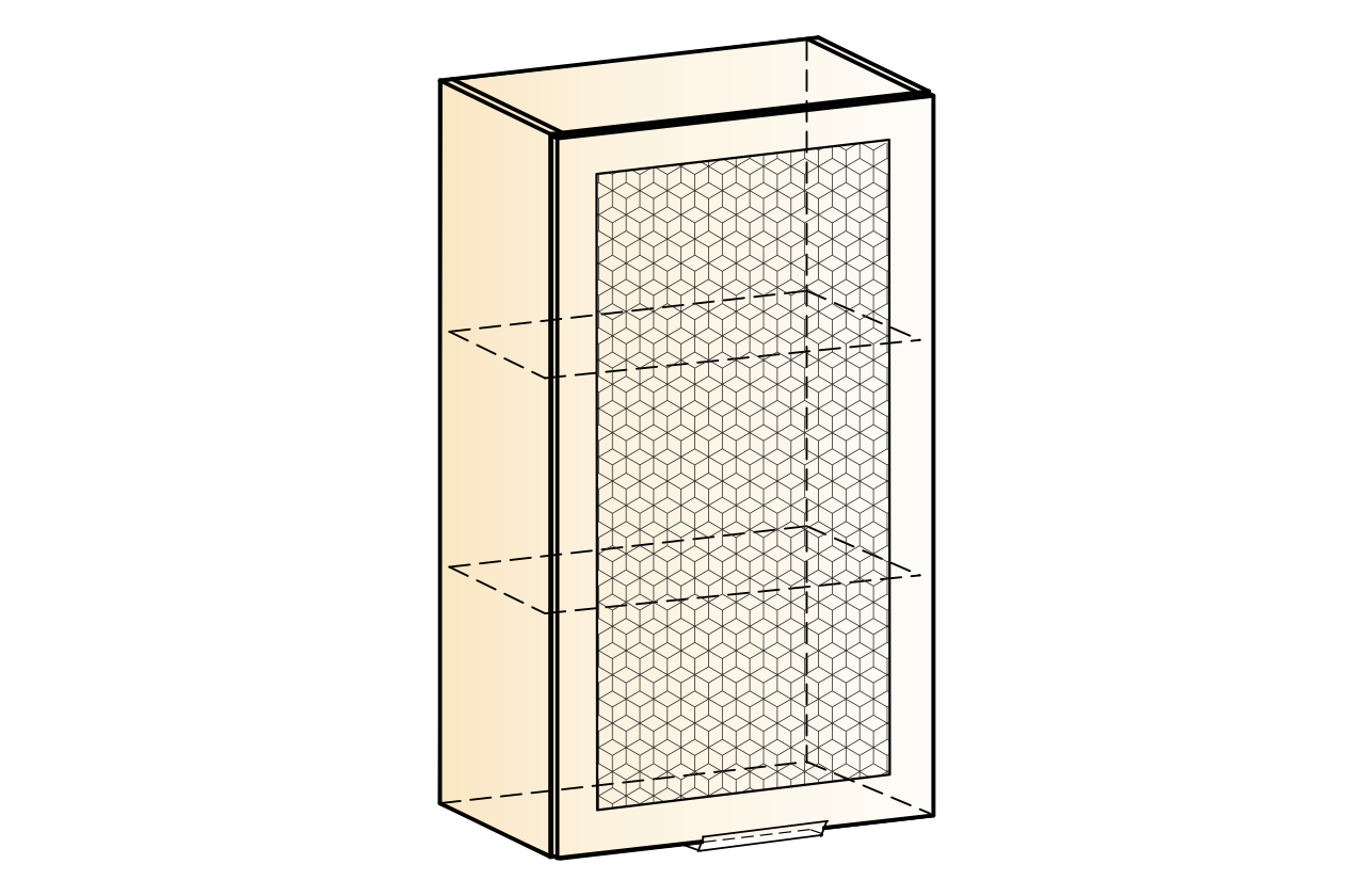 Навесной шкаф, с полками из серии «Стоун». Замечательно подойдет для хранения специй и круп, а так же посуды. Принтерный рисунок на стекле подчеркивает общий стиль кухни.