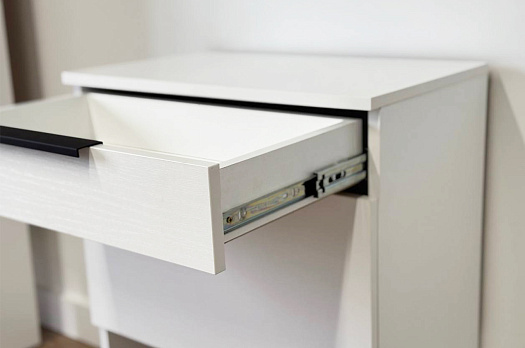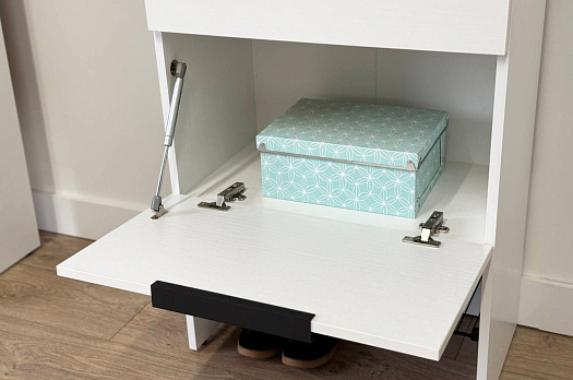 Изготовленная из прочного ЛДСП толщиной 16 мм, обувница обеспечивает надежность и долговечность. Выкатной ящик на шариковых направляющих позволяет легко и плавно открывать и закрывать его, предоставляя дополнительное место для хранения мелочей.