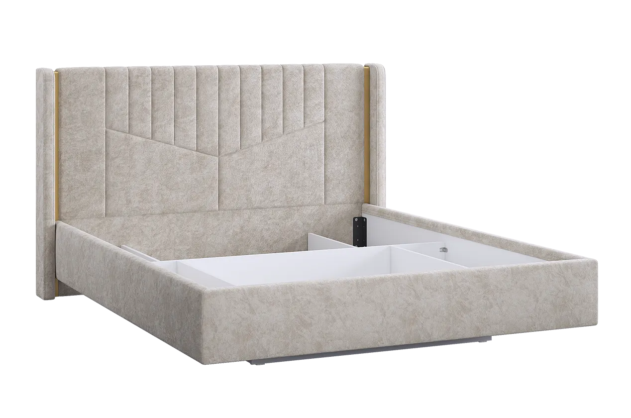 Каркас выглядит аккуратно и визуально лёгким благодаря эффекту "парящей" кровати, что также облегчает уборку - под основание свободно проходит робот-пылесос. Велюр обладает свойствами антипальцы и антикоготь, а съёмный чехол на царгах можно легко снять и очистить при необходимости. Декоративная золотая вставка по бокам изголовья добавляет модели изысканный акцент и делает её выразительным элементом интерьера.