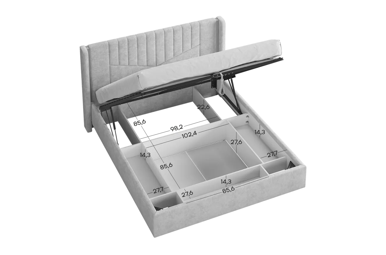 Подъёмное основание открывается легко и бесшумно благодаря газлифту, обеспечивая широкий угол подъёма и доступ к большому отделению для хранения вещей. Под кроватью размещён вместительный короб с прочными перегородками - идеальное место для постельного белья, одеял и сезонных вещей.