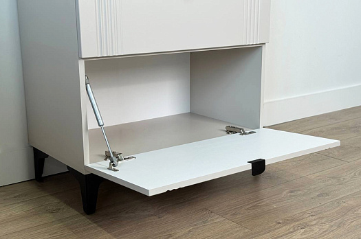 Комод изготовлен из качественных материалов: корпус выполнен из ЛДСП, что гарантирует прочность и долговечность, а фасад, выполненный из МДФ в плёнке ПВХ, не только выглядит эстетично, но и защищает комод от повреждений. Особое внимание заслуживает фрезеровка фасадов, которая придаёт изделию изысканный вид.