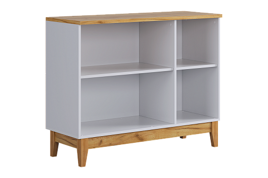 Корпус комода выполнен из ЛДСП в цвете белое дерево, что придаёт ему светлый и уютный вид, характерный для скандинавского дизайна. Фасады – из МДФ с фрезеровкой, покрытые матовой белой плёнкой, что подчёркивает натуральность текстуры и создаёт ощущение лаконичности.