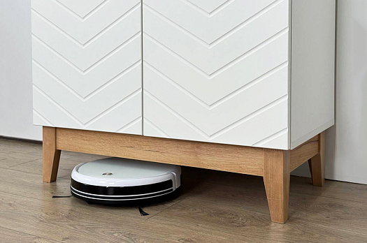 Корпус шкафа выполнен из ЛДСП в цвете белое дерево, что придаёт ему светлый и уютный вид. Фасады – из МДФ с фрезеровкой, покрытые матовой белой плёнкой, что подчёркивает натуральность текстуры и создаёт ощущение лаконичности.