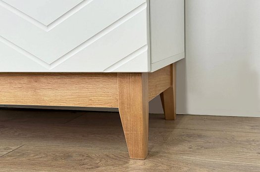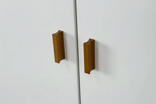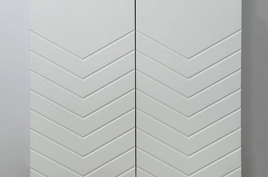 Корпус шкафа выполнен из ЛДСП в цвете белое дерево, что придаёт ему светлый и уютный вид. Фасады – из МДФ с фрезеровкой, покрытые матовой белой плёнкой, что подчёркивает натуральность текстуры и создаёт ощущение лаконичности.