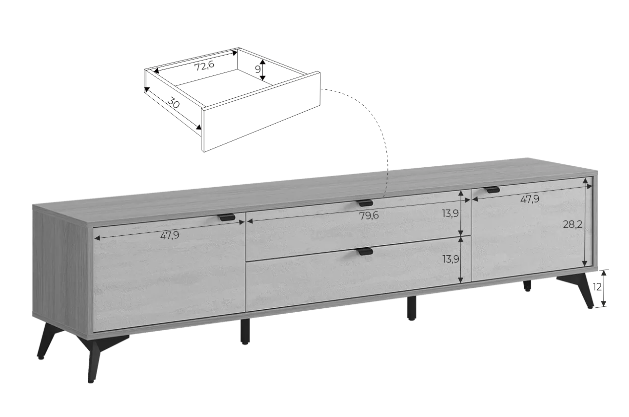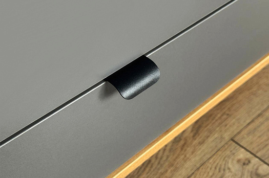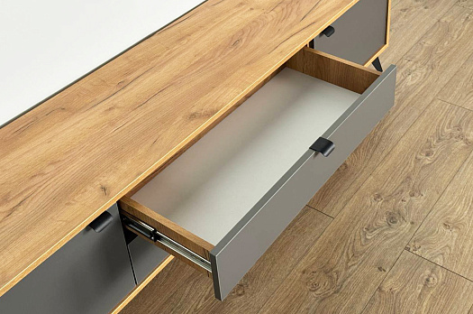 Модель выполнена из ЛДСП толщиной 16 мм, оснащена двумя выдвижными ящиками на шариковых направляющих и двумя закрытыми секциями.